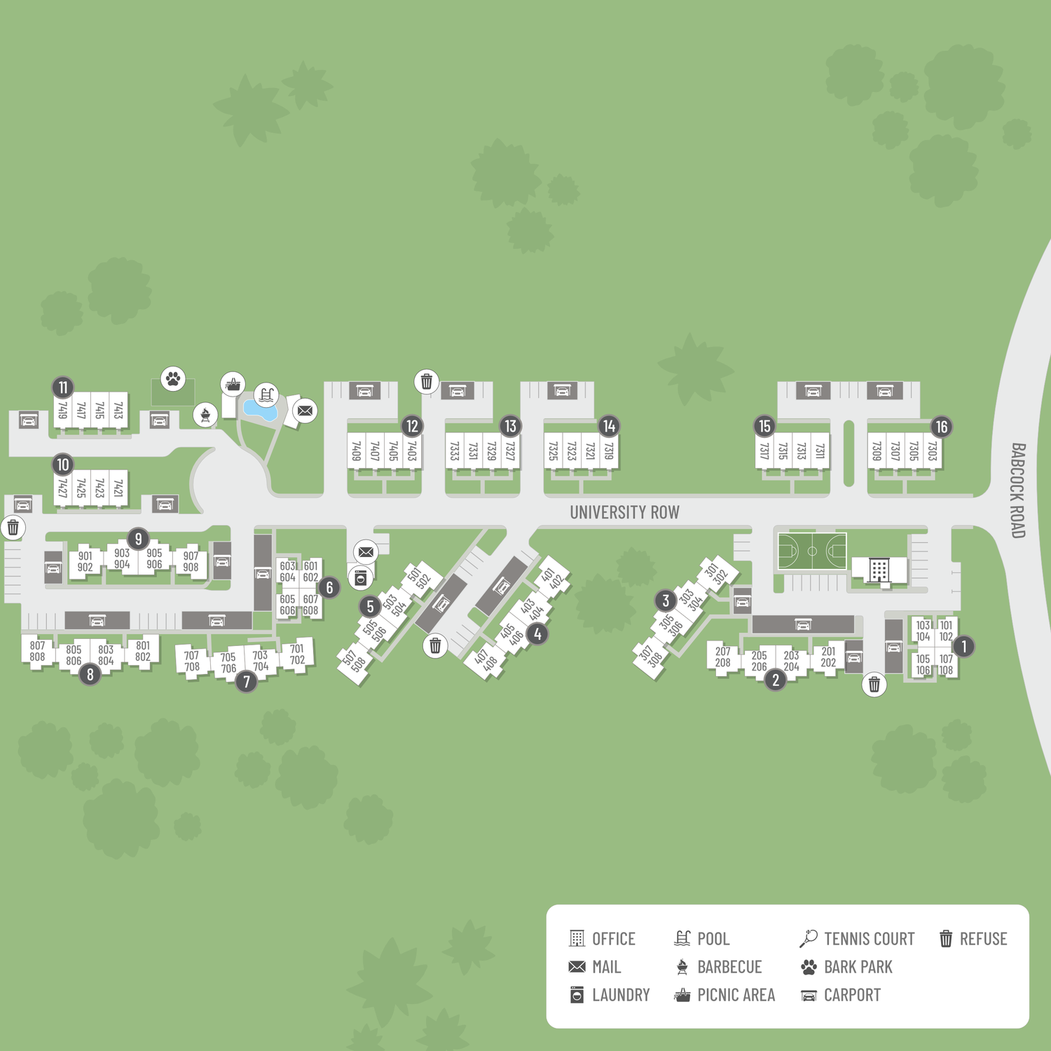 Select a floor plan or bedroom count to view those units on the overhead view on the site map. If you need assistance finding a unit in a specific location please call us at 210-796-7459 TTY: 711.